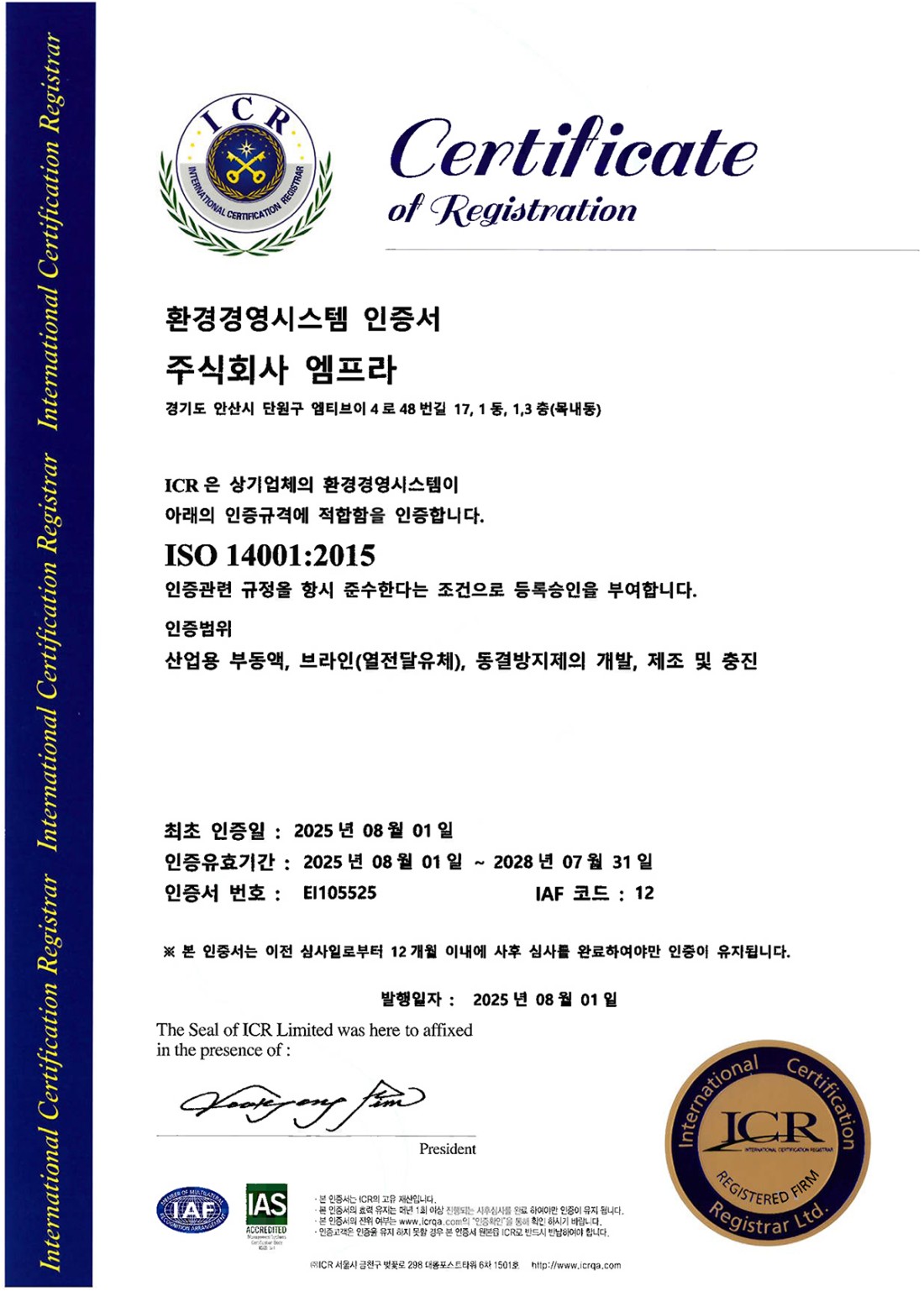 ISO14001:2015 환경경영시스템 인증서